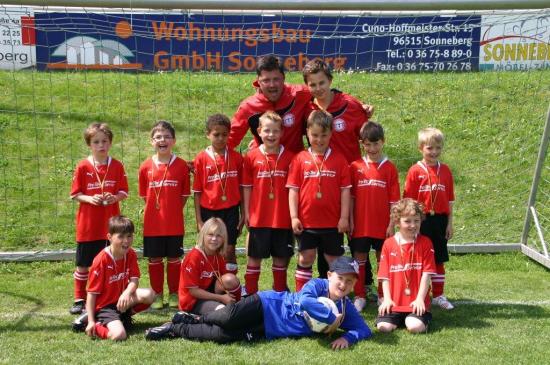 Sonneberg - Stadion. War doch die glückliche Qualifikation zur Meisterrunde für unsere junge F-Jugendmannschaft bereits ein Riesenerfolg, so überraschten die Heyder-/Müller-Kids heute mit einem starken dritten Platz. Wir gratulieren der Mannschaft, den Trainern und den Eltern! Der Bericht von Danny Heyder: Ein Dankeschön geht an alle Eltern für die tolle Unterstützung! Eishausen - Eisfeld 3:0, Sonneberg-West - FC Sonneberg 0:1, Rauenstein - SV Steinach 2:0, FC Sonneberg - Eishausen 1:0, Eisfeld - Rauenstein 0:1, SV Steinach - Sonneberg-West 0:0, Eishausen - Rauenstein 0:2, FC Sonneberg - SV Steinach 1:0, Sonneberg-West - Eisfeld 3:1, Eishausen - SV Steinach 2:0, Rauenstein - Sonneberg-West 4:0, Eisfeld - FC Sonneberg 0:2, Sonneberg-West - Eishausen 2:0, SV Steinach - Eisfeld 3:0, FC Sonneberg - Rauenstein 0:0