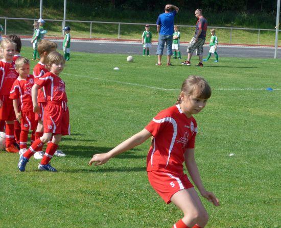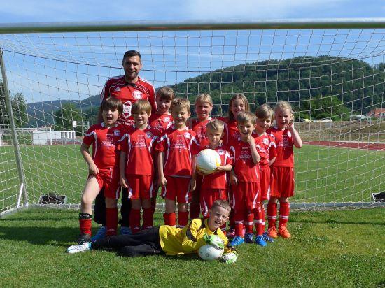 Im Sonneberger Stadion musste man sich mit den Mannschaften des FC04 Sonneberg, SC 09 Effelder und Schleusingen auseinander setzen. Gleich im ersten Spiel unterlag man Effelder mit 1:4, wobei mehr drin gewesen wäre. Die zweite Partie gegen Sonneberg wurde nach tollem Spiel mit 1:3 verloren, hier hätte man nach 5 Minuten aber 4:0 führen können, mehrfach scheiterte man am Aluminium oder am starken Sonneberger Torwart. Im letzten Spiel der ersten Runde führte man schnell mit 2:0 gegen Schleusingen, musste aber durch Unkonzentriertheiten den Ausgleich hinnehmen, als dann kurz vor Schluss Lara das 3:2 erzielte, glaubten alle an den ersten Sieg …leider fiel mit dem Schlusspfiff der nicht unverdiente Ausgleich. Danach wechselte man den Torwart und Niclas unterstützte Elli im Angriff, Fredric stand nun zwischen den Pfosten und sollte Gegentore verhindern. Die Rückrunde begann wie die Vorrunde ..Effelder setzte sich wieder mit 4:1 gegen die Germanen durch, dann sollte die eigentlich große Überraschung folgen… Gegen Sonneberg 04 wurde ein großartiges Spiel gemacht, und Elli fügt der Heimelf die erste Saisonniederlage überhaupt zu, zu ihren 3 Treffern und einer bombenfesten Abwehr um Sophie, Vanessa und Lara fanden die FCler kein Gegenmittel. Im letzten Spiel gegen Schleusingen sah man den Kräfteverschleiß bei den Kindern von Minute zu Minute…die Hitze tat ihr Übriges. Leider wurde dieses Spiel dadurch verloren und der dritte Platz war dahin. Dennoch sind alle mächtig stolz auf den vierten Platz und können mit Elli Bartl (45 Tore) den amtierenden Torschützenkönig der Bambinis präsentieren. Effelder wurde auf Grund der spielerischen Reife verdient Kreismeister und darf zu recht feiern. Ein besonderes Lob geht noch an Sophie, sie spielt erst drei Wochen Fußball, war aber an diesem heißen Sonntag fleißig wie eine Biene und half ihrer Mannschaft an alle Ecken und Enden. Aufgebot: Niclas, Ludwig, Elli, Sophie, Lara, Felix, Paul, Thea, Roland, Vanessa, Fredric Meisterrunde in Sonneberg: Schleusingen – FC Sonneberg 1:1/0:2, Sonneberg-West – Effelder 1:4/1:4, FC Sonneberg – Sonneberg-West 3:1/1:3, Effelder – Schleusingen 0:0/3:0, Schleusingen – Sonneberg-West 3:3/2:0, FC Sonneberg – Effelder 1:1/2:3 1. SC 09 Effelder 6 4 2 0 15: 5 14 2. 1. FC Sonneberg 04 6 2 2 2 10: 9 8 3. SC 07 Schleusingen 6 1 3 2 6: 9 6 4. Germania Sonneberg-West 6 1 1 4 9:17 4 Platzierungsrunde in Sonneberg: Judenbach – Lauscha/ Neuhaus 2:1/1:1, Hinternah – Crock 1:4/0:4, Lauscha/ Neuhaus – Hinternah 0:1/0:1, Crock – Judenbach 2:2/3:1, Judenbach – Hinternah 2:1/0:0, Lauscha/Neuhaus – Crock 1:0/2:1 5. SG Lauscha/Neuhaus 4 2 1 1 5:4 7 6. SV Germania Judenbach 4 1 2 1 6:7 5 7. SV Edelweiß Crock 4 1 1 2 6:6 4 SV Nahetal Hinternah außer Wertung |