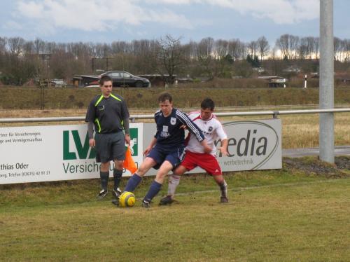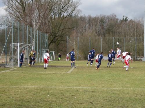 Die Gäste kamen besser aus den Startlöchern, hatten sie doch auch bereits zwei Spiele bestritten und waren bereits in ihrem Rhythmus. Die Germanen hatten so ihre liebe Müh mit dem tiefen Geläuf und den agilen Gegnern. Keeper Rebhan war aber von Beginn an hellwach und faustete die Kugel vor dem bereitstehenden Weber aus dem 16er (8.). Soer nutzte einen Fehler von Libero Fischer, scheiterte aber ebenfalls an Rebhan. Jener Soer tauchte auch nach 22 Minuten noch einmal im Strafraum der Hausherren auf, verzog jedoch aus abseitsverdächtiger Position. Nachdem Assiner eine Freistoß neben das Gehäuse setzte bemühten sich auch die Westler um den Angriff. Wischnewski hielt einen Freistoß von Dorst sicher (30.). Eine Minute später wurde Marcel Lehneck frei gespielt und erzielte die glückliche Führung für die Hausherren. Sieben Minuten vor der Pause ließ Rexheuser das 2:0 folgen, aus spitzem Winkel köpfte er über Keeper Wischnewski hinweg ins Tor.