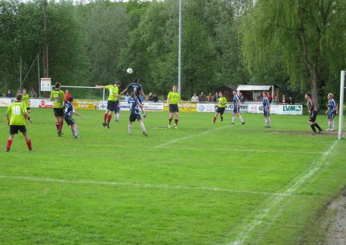Gleich zu Beginn gab es einen Paukenschlag: Mike Eber trat eine Freistoß flach in den 16er, Nico Böhm lenkte den Ball zur Frühen Führung ins Tor (2.). Die Gäste zeigten sich wenig beeindruckt, Wiener setzte sich gegen Haas und Eber durch und schoss zum Ausgleich ein (8.). Wenig später parierte Rebhan einen Schuss Rosemanns sicher, bevor Büchner ein Solo ansetzte, welches Lehneck zum 2:1 veredelte (12.). Nach der hektischen Anfangsphase kehrte etwas Ruhe ein, beide Teams versuchten sich erstmal an den aufgeweichten Platz zu gewöhnen. Etliche Wasserlachen machten es den Akteuren jedoch nicht leicht. Nach einer halben Stunde prüfte Allmeritter Rebhan mit einem Kopfball, Lehneck hatte auf der Gegenseite mit einer Direktabnahme kein Glück. In den letzten Minuten der ersten Hälfte ging es noch mal rund. Allzeit blieb Sieger gegen Böhm und später Ditscheid. Zwischendurch waren sich die Germaniaverteidiger nicht einig, bekamen den Ball nicht weg und erneut schoss Wiener zum Ausgleich ein (39.).