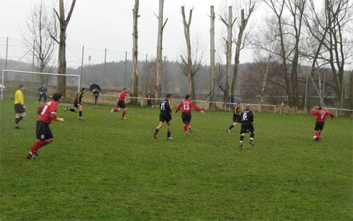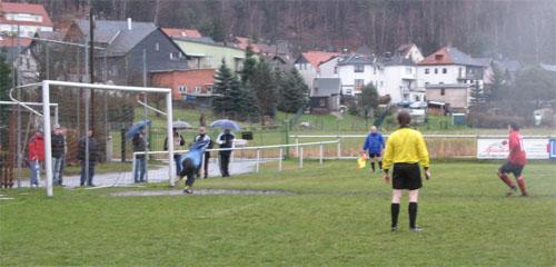 Die standhaften Beobachter dieses Spektakels sollten ihr Kommen dennoch nicht bereuen. Es entwickelte sich ein munterer Schlagabtausch, bei dem die Abwehrreihen mit ihren Chefs Jens Scharfenberg und Mike Eber zunächst Oberwasser hatten. Schiedsrichter Toni Wagner erkannte den Westlern ein Ditscheid-Tor wegen Abseits ab; einige gut postierte Zuschauer sahen das anders (15.). Auf der Gegenseite parierte Marco Lichtenstein gegen Tobias Wicklein und Jens Meusel, bevor die Germania durch Neuzugang Steve Bätz nach feinem Zuspiel in Führung ging (19.).