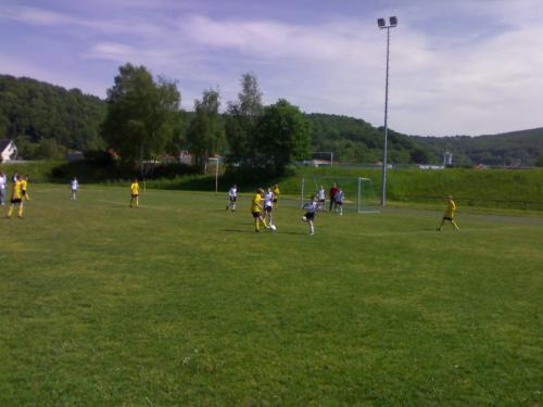 Die Jungs aus Sonneberg gingen als Tabellenführer gewohnt ballsicher in die Partie und hatten bereits nach wenigen Minuten ihre ersten Torchancen. Jeder hatte mit diesem Verlauf gerechnet, denn die Sonneberger hatten in dieser Saison noch keinen Punkt abgeben müssen und standen souverän an der Spitze der Tabelle. Doch die Mannschaft, die einen Platz dahinter stand, fand so langsam in die Partie und erspielten sich nach 5 Minuten ein Übergewicht heraus und spielte einen sehr guten Fussball. Die Westler schafften es sogar, die Sonneberger in ihrer eigenen Hälfte regelrecht einzuschnüren. Daraus resultierend schoss Marcel Preissler in der 13. Spielminute das 1:0 für die TSV "Germania 1884" Sonneberg-West. Danach rieben sich die zahlreichen Mütter der Sonneberger verdutzt die Augen, denn in Rückstand geraten, war diese Mannschaft noch nie. Genau so verlief auch das weitere Spiel. Der Tabellenführer kam mit der Situation überhaupt nicht klar und verloren total den Faden des Spiels. Die Westler spielten ihren Fussball mit dem sie auch in den letzten Wochen erfolgreich waren und wurden vier Minuten vor der Pause mit dem 2: 0 belohnt. Michell Baack setzte sich herrlich in der Mitte durch, zog ab und erziehlte die Zwei-Tore-Führung. War das schon die Vorentscheidung?