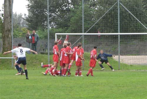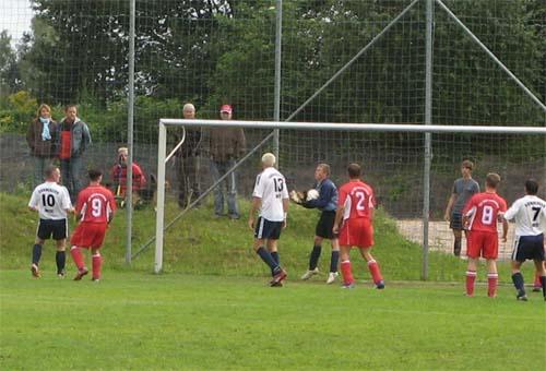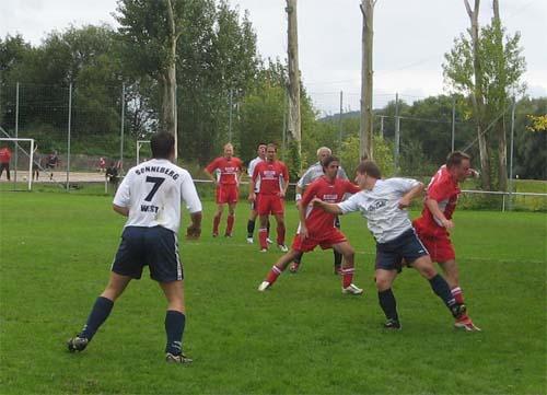 Das erste Achtungszeichen kam von den Gästen, doch Eberleins Schuss ging knapp vorbei (8.). Nach einem Doppelpass mit Nicolai hatte der aufgerückte M. Eber eine gute Gelegenheit, verzog jedoch (10.). Der TSV versuchte in dieser Phase über Kampf das Spiel in den Griff zu bekommen und erarbeitete sich gegen die kompakt stehenden Gäste die ein oder andere Gelegenheit. Zunächst eine verheißungsvolle Aktion von Bätz nach Vorarbeit von Rexheuser, der aber besser Ries den Ball gelassen hätte. So konnte ein Ummerstadter Verteidiger noch klären (13.). Die beste Gelegenheit hatte dann Rexheuser, der sich nach Anspiel von Homuth im Strafraum durchsetzte, aber genau auf den Torwart schoss (19.). Danach ziemlich viel Leerlauf auf beiden Seiten, konstruktive Spielzüge waren die Ausnahme. M. Eber für die Westler mit fulminantem Schuss (30.) und Eberlein für Ummerstadt (33.) hatten die nächsten Gelegenheiten. Kurz darauf die zu diesem Zeitpunkt überraschende Führung für die Gäste. Der aus den Alten Herren reaktivierte Thomas Spörl schoss unglücklich mit links den eigenen Mann an und Eberlein fiel der Ball vor die Füße – es folgte eine sehenswerte Direktabnahme über den machtlosen Lichtenstein (35.). Die Germania versuchte zu antworten, doch die Mittel dazu waren nicht geeignet, die Gäste in Verlegenheit zu bringen. Diese wiederum nutzten nun die Nachlässigkeiten in der Bettelhecker Defensive und hatten binnen weniger Sekunden drei 100%ige Chancen, doch die Latte und ein wahnsinnig haltender Lichtenstein bewahrten die Germania (noch) vor dem vorentscheidenden 0:2.