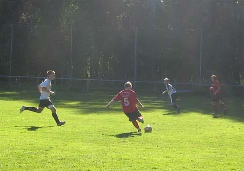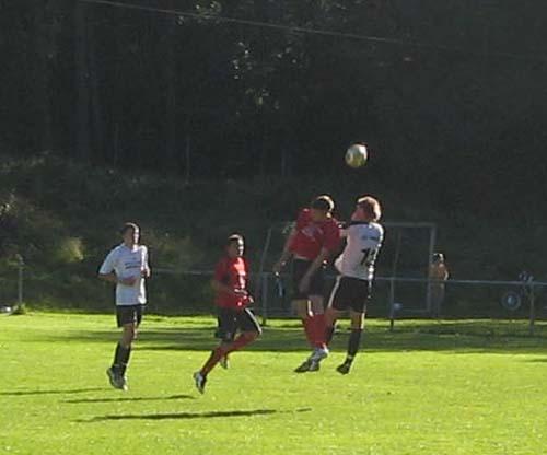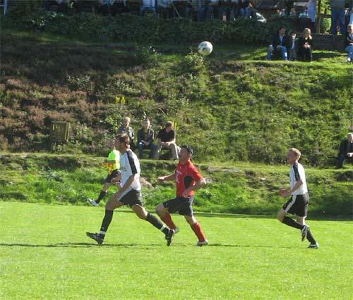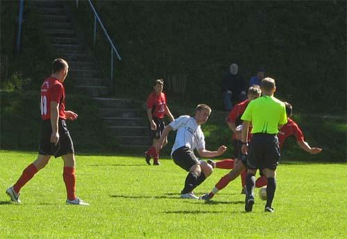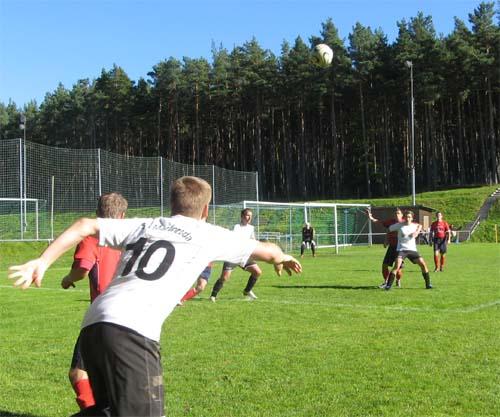 Doch zunächst hatten die Recknagel-Schützlinge 99 Minuten Schwerstarbeit zu verrichten und gingen dabei an ihre derzeitige Leistungsgrenze. Die Gastgeber bestimmten am Anfang das Spiel und erarbeiteten sich erste Schusschancen, die aber alle das Vorndran-Gehäuse verfehlten bzw. das Außennetz touchierten (12.). Anders der dieses Mal als zweite Spitze aufgebotene N. Eber, der nach Vorarbeit von Homuth und Bätz den Ball mit Links ins Dreiangel drosch (17.). Danach wieder Druck durch die Gastgeber, doch weder ein Berlt-Freistoß (18. – hauchdünn vorbei) noch ein Baranovski-Schuss (19. - Vorndran sicher) führten zum Erfolg. Nach kurz ausgeführtem Freistoss drang Müller in den Strafraum ein, doch der Bettelhecker Torwart parierte erneut. Den Westlern gelang es aber immer wieder, gefährlich vor dem gegnerischen Tor aufzutauchen, so z.B. durch den lauffreudigen Matthes, dessen Schuss mit der Pike Geishendorf aber stark abwehrte (29.). Den darauffolgenden Eckball vergab Bätz freistehend per Kopf.