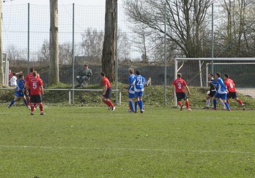 Die erste Gelegenheit hatte Rexheuser nach Freistoß Homuths; der Kopfball touchierte jedoch nur das Außennetz (10.). Die Gäste antworteten umgehend, doch Lichtenstein hatte keine Probleme mit Zetzmans 22m-Schuss. Es folgte ein munterer Schlagabtausch: A. Fischer verpasste nur knapp eine Homuth-Eingabe (15.), während Lichtenstein mit dem Fuß gegen Göhring klärte und die Abwehr der Gastgeber einen weiteren Zetzmann-Schuss zum Eckball abblockte (20.). Danach folgte ein schöner Angriff der Germania über Meusel und Rexheuser, der den Ball direkt für den dieses Mal als Stürmer aufgebotenen N. Eber auflegte – leider traf dieser den mit vollem Risiko genommenen Ball nicht richtig (26.). Nachdem Lichtenstein einen Schuss Löbels sicher fasste (28.), musste er nur kurz darauf prallen lassen und attackierte den Falkenangreifer. Dieser kam aus dem Tritt und die Sachsenbrunner Zuschauer forderten Elfmeter, den Neumann allerdings nicht gab. Glück für die Westler. Nach einem Freistoß von M. Eber setzte Rexheuser einen Fallrückzieher an, der leider knapp am Tor vorbei ging (38.).