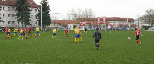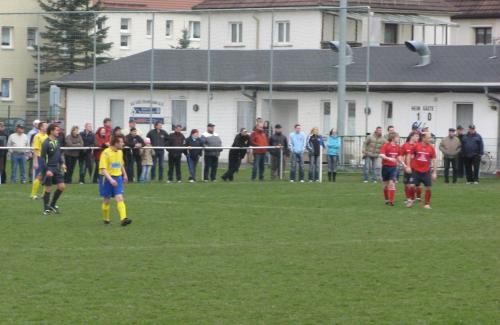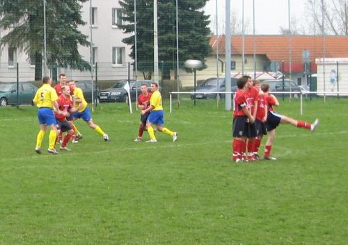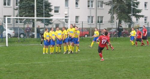Beide Mannschaften begannen die Partie mit großem Respekt voreinander, den beiden Teams war schon anzumerken, das keiner den ersten Fehler machen wollte. Zudem schlug sich dieser Umstand auch im Gesamtbild nieder, es konnte kein Traumfußball zu Stande kommen, zu sehr waren taktische Zwänge in den Köpfen der Spieler verwurzelt. So kam es, das sich das Niveau der Partie dem schlechten Wetter anpasste. Aber nach der Anfangsviertelstunde wurde es besser, da sich auf beiden Seiten die Nervosität gelegt hatte. Die erste echte Chance im Spiel hatten die Platzherren durch Stefan Gruber per Freistoß, der nur knapp über das Gehäuse von Marco Lichtenstein strich (19.). Kurz darauf bediente Danny Peterhänsel seinen Kapitän Stefan Gruber mustergültig, dieser verzog nur knapp. Nur wenig später verfehlte ein schöner Schuss von Marian Rexheuser nur knapp das SG-Gehäuse. Dann hatten die Westler eine Möglichkeit per Eckstoß, diese Situation entschärfte Michael Funke und Robert Fritzlar klärte endgültig (26.). Dann hatte Stefan Gruber die Möglichkeit per Kopfball (36.). Die Partie war nun auf jeden Fall sehenswert und die Zuschauer bekamen mehr geboten. Kurz darauf entschärft Marco Lichtenstein einen straffen Schuss von Stefan Gruber (38.). Dann hatten die Gäste noch mal eine gute Möglichkeit nach einer Hereingabe von Christopher Baumann, hier verpassten Kapitän Andreas Fischer und Marian Rexhäuser einschussbereit wirklich nur knapp. Mit einem alles in allen gerechten 0:0 ging es in die Kabinen.