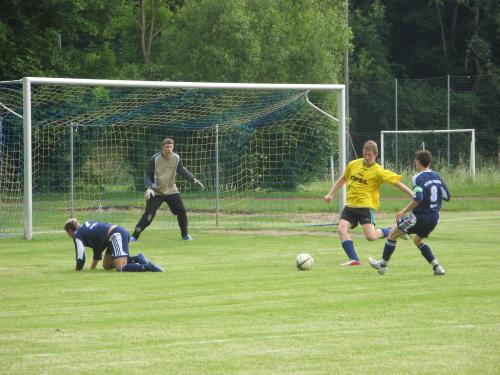 Nach der Pause drückten die Germanen die Gastgeber nun immer mehr in ihre Hälfte und Hülss' Solo wurde im Strafraum per Foul gestoppt, der fällige Pfiff blieb jedoch aus (47.). Die Gastgeber kamen nun nur noch selten vor das Stolze-Tor, doch dann brannte es lichterloh. Teilweise wurden die Hochkaräter schon kläglich vergeben. Auf der Gegenseite verfehlte der aufgerückte Vorndran dann knapp das Tor (59.). Der inzwischen in den Sturm gewechselte Libero avancierte zum auffälligsten Westler und legte Döbrich eine Supergelegenheit auf, doch den schwachen Innenspanstoss parierte Hofmann erneut (70.). Nach einem Eckball der Westler reklamierten die Germanen Handspiel, doch der Schiedsrichter ließ erneut für Veilsdorf laufen und aus diesem Angriff entstand das 3:1, wobei der frei vor Stolze auftauchende Knauer mit Hilfe des Innenpfostens traf (72.). Wer nun dachte, die Messe ist gelesen, hatte nicht mit der Moral der unverdrossen weiter spielenden Westler gerechnet. Zunächst scheiterte der frei vor Hofman auftauchende Vorndran noch am Keeper (77.), doch kurz darauf legte er den Ball von der Grundlinie quer und Lehneck I hämmerte den Ball problemlos unter die Latte (79.). Veilsdorf war nun stehend KO und wollte den knappen Sieg über die Zeit bringen. Erneut ging Vorndran in den Strafraum, spielte zwei Gegner aus und wurde danach brutal von den Beinen geholt. Elfmeter. Wer sollte schießen? Nach einiger Diskussion schnappte sich der Gefoulte selbst die Kugel und verwandelte sicher (89.). Unglaublicher Jubel der Westler nach dem Abpfiff, denn mit diesem Punkt gewannen die Westler die Meisterschaft der Spielunion vor den punktgleichen Muppergern.