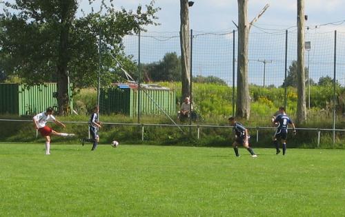 Nach etwa einer halben Stunde mussten die Germania-Fans erstmals zittern. Frank Ditscheid, der viele gute Szenen hatte, aber seine frühere Form noch nicht erreicht hat, vertendelte den Ball. Sören Frischmuth startete in den freien Raum und hob den Ball nicht nur über den herauseilenden Torhüter Lichtenstein, sondern auch übers Gebälk. Das war die bis dato größte Chance überhaupt. Auffällig, dass die Germania ihre anfangs gezeigte spielerische Linie mehr und mehr verließ und der Gast demzufolge nahezu Gleichwertigkeit erreichte.