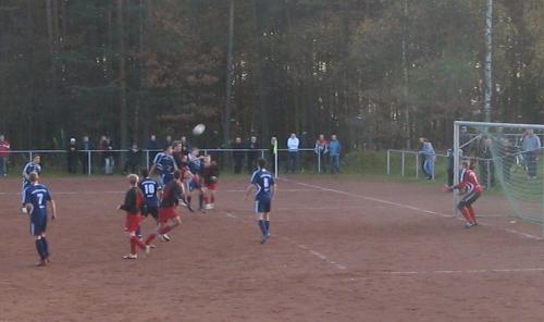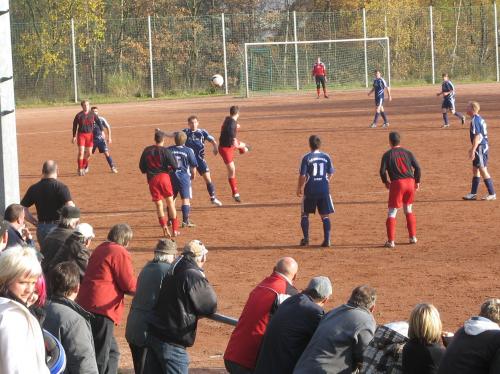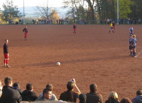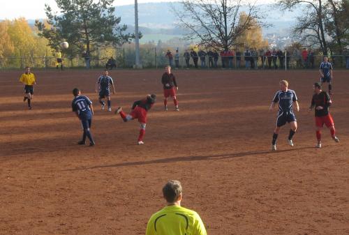 Dabei begann das Spiel mit einem Paukenschlag für Neuhaus, als Martin Gelbricht in der ersten Minute bereits das 1:0 erzielte. Vorausgegangen war ein weiter Ball, den Michael Oehne von seiner Liberoposition in die gegnerische Hälfte schlug. Sein Gegenüber, Mike Eber verlängerte per Kopf zu Keeper Vorndran, doch dabei sprang der Torschütze dazwischen und brachte per Heber die Kugel im Tor unter. Besser konnte der Beginn für Neuhaus nicht laufen, aber keine zehn Minuten später dribbelte Ditscheid sich auf der rechten Seite durch, flankte den Ball präzise nach innen und Torjäger Markus Büchner zog direkt aus der Drehung ab und erzielte den Ausgleich. Dies war zugleich der schönste Spielzug im gesamten Derby. Die Sonneberger verstanden es besser den Ball zu führen und auch laufen zulassen, die Gastgeber hielt dem mit viel Einsatzwillen und Laufbereitschaft dagegen. Es entwickelte sich mit Fortdauer eine ausgeglichene Partie, wobei beide Mannschaften aus einer sicheren Abwehr heraus das Spiel taktierten. Die Chancen waren dadurch bedingt rar gesät und beschränkten sich auf ein paar wenige Fernschüsse bzw. Standards auf beiden Seiten. Die Stürmer hatten einen schweren Stand an diesem Tage, denn die Verteidiger nahmen ihre Gegner eng an die Ketten. Gelbrichts Kopfball nach einem Freistoss von Oehne ging knapp neben das Tor und war gleichzeitig der Schlusspunkt in der ersten Spielhälfte.