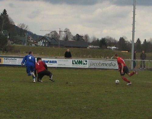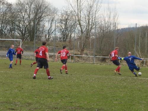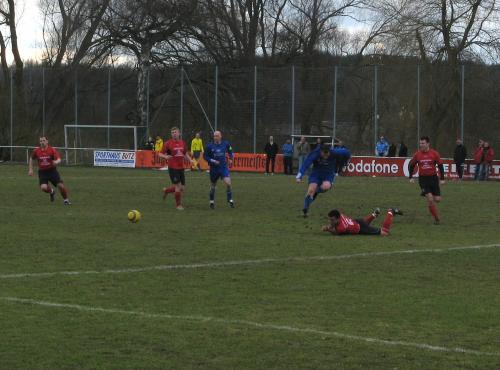 Nach der Pause mussten beide Teams dem tiefen Geläuf ihren Tribut zollen, denn das Spiel wurde nun ruppiger. Immer häufiger wurden Aktionen des jeweiligen Gegenspielers durch Fouls unterbunden. Beide Teams waren hier nicht zimperlich, wobei die Gäste aber deutlich härter vorgingen. So holte Fließbach Ditscheid im 16er von den Beinen. Schiri Menzel entschied sofort auf Strafstoß, beließ es jedoch bei einer Verwarnung. Rot wäre hier auf alle Fälle vertretbar gewesen. Den fälligen Elfer versenkte Büchner sicher zum 2:0 (60.). Überhaupt hatten die Westler einige Hochkaräter zu verzeichnen. Ditscheid versiebte eine Vorlage Büchners von der Strafraumgrenze, der eingewechselte Matthes köpfte eine Flanke knapp am Tor vorbei (65.). Warum die Germania in den letzten 20 Minuten die Ordnung im Defensivverbund ad acta legte, kann nicht mit Gewissheit gesagt werden. Jedenfalls wurde den Gästen nun immer mehr Raum gewährt, immer häufiger blieben einige Germanen nach erfolglosen Angriffen in des Gegners Hälfte stehen. So konnten Spindler gerade noch am Schuss gehindert werden, Torwart Rebhan zeigte gegen Barth eine klasse Fußabwehr. Kurz vor Spielende war es dann aber soweit: Über wenige Stationen gelangten die Gäste vors Bettelhecker Tor, wo Nico Heyder allein darauf wartete zum Anschlusstreffer einzuschießen (86.).