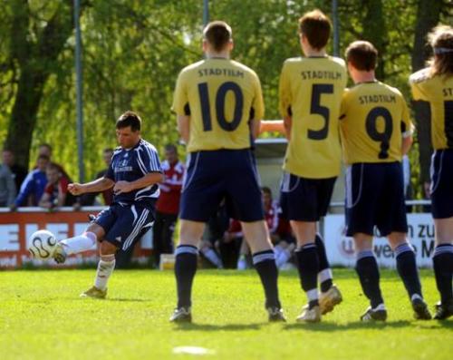 Aufregung in der Nachspielzeit Wie schon in der Vorwoche beim Auswärtsspiel gegen Oberland zeigten die Stadtilmer auch beim Tabellendritten Sonneberg-West eine ansprechende Leistung. Zu Beginn hatten die Blau-Weißen sogar mehr vom Spiel und auch schon in der siebten Minute durch Seichter ihre erste gute Gelegenheit. Doch dann kamen die Gastgeber stärker auf. Ein erstes Achtungszeichen setzte dabei Rexhäuser, dessen Schuss knapp am linken Pfosten vorbei pfiff (14.). Auf der Gegenseite rutschte Torwart Rebhan bei einem Distanzschuss von Würfel weg und konnte gerade noch Schlimmeres verhindern (31.). Eine strittige Situation gab es in der 45. Minute. Nach einem eher unabsichtlichen Handspiel von Libero Hartrumpf zeigte Schieri Wilhelm (Leimrieth) vor 120 Besuchern auf den Strafstoßpunkt. Bätz verwandelte zum 1:0 flach ins linke Eck (45.).