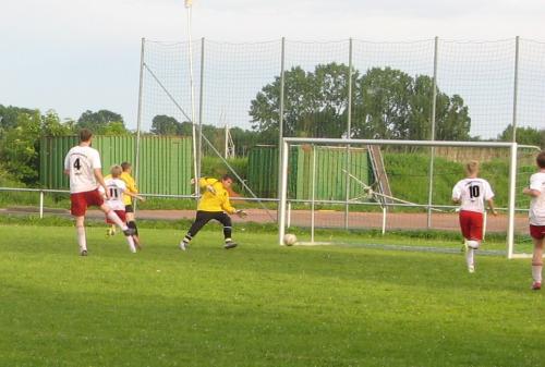 Die Gäste gingen bereits in der Anfangsphase in Führung und hatten auch in der Folge mehr Ballbesitz, ohne dabei wirklich zu glänzen. Solange bei einigen Westlern die Kräfte reichten, wurde der knappe Rückstand gehalten und sich auch einige gute Chancen heraus gespielt (Kopfball Zentgraf). So benötigten die Krasemann-Schützlinge schon einen berechtigten Neunmeter kurz vor der Halbzeit, um die Führung auszubauen. Allerdings übersah der sonst richtig gut leitende David Vorndran vorher ein klares Foulspiel an den Germanen. Dies sollte aber der einzige Wackler bleiben.