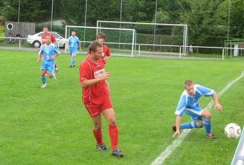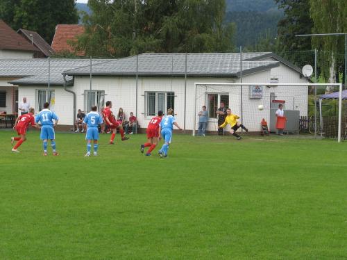 Karl, der sich etliche kleine Scharmützel mit Schiri Heumann leistete, drang nach gut 20 Minuten in den Strafraum ein und wurde gefoult. Den fälligen Elfer verwandelte Michael Mann sicher (Bild). Die Gäste, als Tabellenzweiter an- und abgereist, wurden nun stärker. Vor allem in Mittelfeld und Abwehr hatten die Gastgeber öfter das Nachsehen.