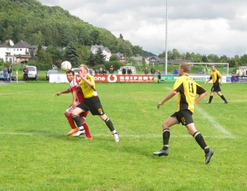 Die Hausherren suchten ihr Glück vom Anstoß weg in der Offensive. Büchner, Ditscheid und Rexheuser konnten ihre Chancen jedoch nicht nutzen. Nach gut zehn Minuten trugen die Gäste ihren ersten Tempogegenstoß vor, Bohnenstengel rettete zur Ecke. Auf der anderen Seite setzte sich Ditscheid erneut durch und passte flach auf Büchner, welcher endlich das 1:0 für die Germanen besorgte (12.). Rexheuser hätte per Kopf erhöhen können, setzte aber leicht zu hoch an. Die Gäste drehten nun etwas auf und hatten durch Chasseur per Freistoß sowie Keßler gute Möglichkeiten, doch entweder die Mauer oder Keeper Bohnenstengel verhinderten einen Gegentreffer. Nachdem Ditscheid einmal mehr am starken Rothamel gescheitert war, nutzte er die nächste Gelegenheit. Rothamel warf sich zwar dazwischen, doch die Kugel flog in hohem Bogen in die Maschen (34.). Zum Ende des ersten Durchgangs kamen die Gäste noch zwei, drei Mal gefährlich vors Germaniator, doch wieder klärte Bohnenstengel einen Kopfball aus Nahdistanz, ein Treffer Flaches wurde wegen Abseits nicht anerkannt.