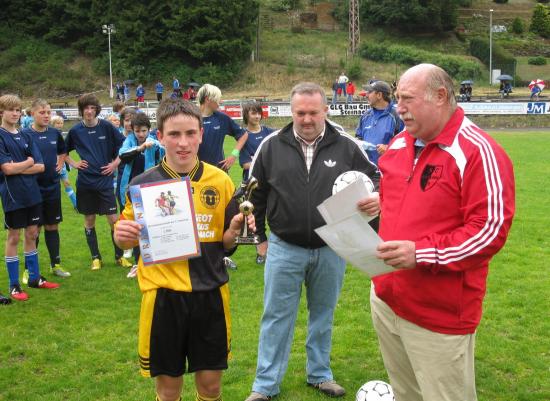 Bei der nachfolgenden Siegerehrung bekam unsere Mannschaft zunächst den Pokal und die Urkunde für den Kreismeistertitel sowie Urkunde, einen kleinen Pokal und einen Ball für den Pokalsieg. Kapitän Marcel Schulz wurde außerdem als bester Torschütze der abgelaufenen Kreisligasaison mit 22 Toren geehrt.