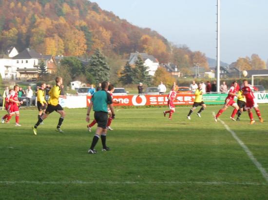 Entgegen vieler Erwartungen gestaltete sich die Anfangsphase ziemlich offen. Struth- Helmershof suchte natürlich den Weg zum Tor, aber auch die Westler wollten nach vorne spielen und die Spitzen Büchner und Ditscheid am Spiel teilnehmen lassen. Die erste wirklich zwingende Möglichkeit für die Gäste ergab sich nach einem Ballverlust der Germania, Roy Kirchner zog über links auf und davon. René Kirchner wollte die flache Eingabe vor einem heraneilenden Stürmer klären, traf aber ins eigene Netz (14.). Die Bettelhecker zeigten sich trotz allem wenig geschockt. Ditscheid vernaschte zwei Verteidiger im Strafraum, kam dann aber doch nicht zum Abschluss. Da etliche Fouls den Spielfluss doch erheblich hemmten, waren gute Szenen rar gesät. Büchner spielte flach auf Ditscheid, Struth konnte gerade noch zur Ecke klären (27.). Auf der Gegenseite zeigte Chasseur sein Können. Ein halbhohes Zuspiel nahm er gekonnt an und zog ab bevor der Ball den Boden berührt hatte (31.). Allerdings verfehlte der Schuss sein Ziel. Als die Germania wieder vorm Gästetor auftauchte sah Schiri Aldegarmann ein Foulspiel an Rexheuser. Der Unparteiische zeigte auf den Punkt und dem vermeintlichen Sünder Eckhardt den roten Karton. Kaum ein Zuschauer konnte sich hierbei ein Schmunzeln verkneifen. Kapitän Fischer lief zum Elfer an, Keeper Rothamel parierte den schwach geschossenen Strafstoß aber sicher (33.). Kurz vor der Pause wurden die Hausherren dann doch noch belohnt. Ein abgefälschter Schuss gelangte irgendwie zu Tommy Gögel, welcher zum durchaus verdienten Ausgleich einnetzte (42.).