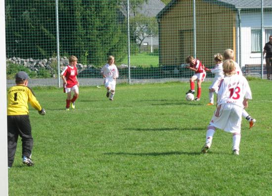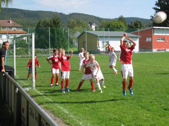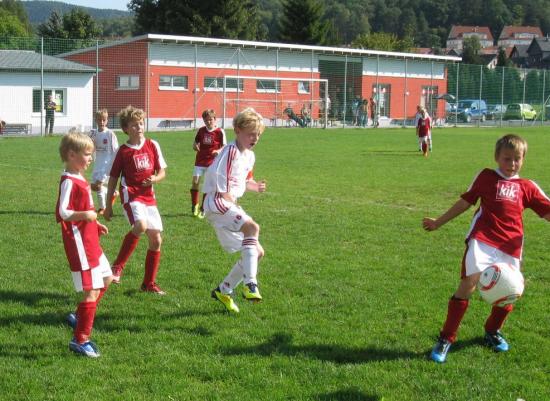 Die Hausherren legten los wie die Feuerwehr und zeigten in der Anfangsphase den zahlreichen Zuschauern (darunter auch die nach Geisa reisende 1. Mannschaft) gefällige Kombinationen über das gesamte Spielfeld. Die Stadtilmer SG brauchte etwas Zeit, bis sie im Spiel war, und da stand es nach zwei Böhme-Toren bereits 2:0. Beim ersten Treffer bereitete die dieses Mal von Beginn an auflaufende Mercedes Liebermann mustergültig vor (5.) und beim zweiten Treffer schloss der Torschütze den Angriff schnell und präzise mit dem schwächeren linken Fuß ab (11.). Die Gäste kamen in der Folge immer besser ins Spiel und deckten die eine oder andere Schwäche im Deckungsverhalten unserer Mannschaft auf. Ein Pfostenschuss durch den wendigen Döbert beantworteten die Germanen mit guten Angriffen über Mercedes Liebermann (am Tor vorbei), Maximilian Böhme (Torwart hielt) und Moritz Michel (Lattenknaller).