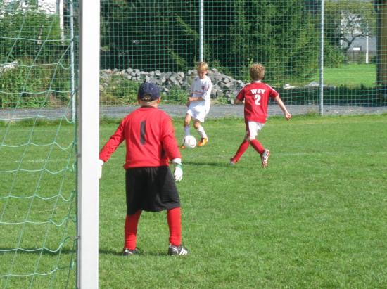 Unmittelbar nach der Pause fiel das 2:1 nach einem Angriff über die Mitte durch Moritz Michel und Klaus Puff hindurch (Mi. Böhme 26.). Doch die folgende Ecke wurde mit der Hand abgewehrt (siehe Bild weiter unten) und Moritz verwandelte den fälligen Neunmeter gewohnt nervenstark (28.). Die Gäste kamen über Döbert noch einmal per Kopf zu einer Großchance, doch Maximilian Nagel im Tor hielt. In der Folge ging den ebenfalls sehr jungen Gästen etwas die Luft aus, und auch die eingewechselten TSV’ler machten mächtig Druck. So fielen in der Schlussphase noch vier weitere Tore durch Moritz Michel (38. – Schuss aus 8m), den aufgerückten Klaus Puff, der einen Gaber-Schuss noch ins Tor grätschte (44.), den immer besser werdenden Luis Stellmacher (48. – schöner Doppelpass und Abschluss ins kurze Eck) und Maximilian Böhme per Fernschuss (50.).