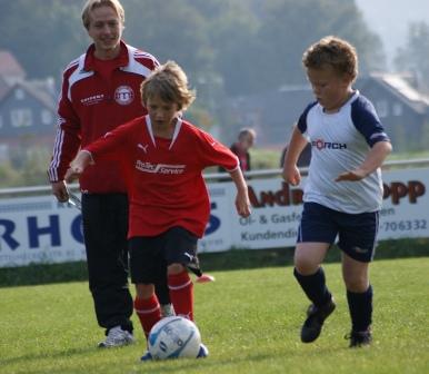 Das letzte Spiel des Tages sollte dann auch das spannendste werden. So trafen die Germanen auf die geheimen Favoriten aus Schalkau. Die Gäste waren gleich von der ersten Minute an voll konzentriert und starteten nach dem Anpfiff gleich zum ersten Angriff. Schöne Spielzüge und harte Zweikämpfe erfreuten die vielen Eltern und Zuschauer. Der Jubel war auf der blau-weißen Seite groß, als die Schalkauer 4 Minuten vor Spielende die Führung zum 2:3 erzielten. Ein scharfer Schuss wurde leider von Franz Liebermann so abgefälscht, dass Torwart Leo Amberg keine Chance mehr hatte. Doch die Gäste hatten die Rechnung ohne die flinken Felix Brückner und Franz Liebermann gemacht. 2 Minuten vor Abpfiff wurde nach einem traumhaften Doppelpass-Spiel ausgeglichen und so trennten sich die Mannschaften mit je einem Punkt.
