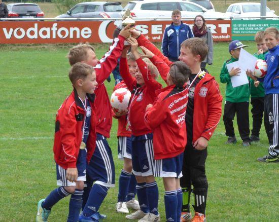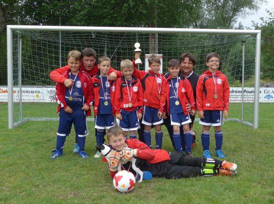 Im letzten Spiel des Spieltages hieß der Gegner FC BW Schalkau. Auch dieses Mal wurde unseren Kindern nichts geschenkt. Auf ein frühes Führungstor fiel nach starkem Druck auf unser Tor nach einem Mißverständnis zwischen Abwehr und Tormann das 1:1. Hierauf packte die Jungs der Ehrgeiz und 5 weitere Tore brachten den Endstand von 6:1 (Tore je 3* Fritz und Tristan). Der Meistertitel nach 9 Siegen und nur einem Unentschieden ist damit mehr als verdient. Aus den Händen von Staffelleiter Matthias Schulz (Köppelsdorf) gab für es den Pokal und Medaillen, wie auch für den Zweiten Steinach und den Dritten Sachsenbrunn.