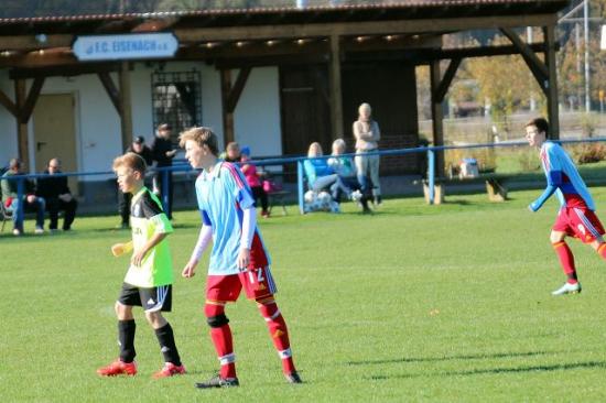 Die Eisenacher waren hoch motiviert, lag doch letzte Woche trotz der knappen Niederlage in Gera, eine kleine Sensation in der Luft. Sie wollten nun endlich ihren 2. Sieg landen. Angestachelt von ihrem Trainer, der bereits in den Anfangsminuten einem Herzinfarkt nahe war und gelinde gesagt, etwas übermotiviert schien, machten die Gastgeber von Beginn an Druck und hatten dabei auch die erste Chance im Spiel. Ihr Torjäger, Jan-Lucas Ullrich, wurde steil geschickt, überlief unsere Abwehr, doch sein Abschluss war zu überhastet und zu ungenau. Und nun war es eigentlich auch schon mit der Eisenacher Herrlichkeit vorbei. Von nun an übernahm unsere Mannschaft das Zepter. Luis trieb im Mittelfeld immer wieder an, aber noch wurden die ersten Torchancen vergeben. Das Spielgeschehen verlagerte sich zunehmend in die Hälfte der Gastgeber. Und wie aus dem Nichts fiel plötzlich das 0:1, Maximilian M. verlängert einen Einwurf mit der Hacke zu Tim, der zieht einfach ab und sein Schuss landet genau im linken Eck. Nur wenig später nutzten wir die Schockstarre der Eisenacher ein zweites Mal aus, Maximilian M. spielt mit Johanna einen feinen Doppelpass und war plötzlich frei vor dem Torwart. Ob gewollt oder ungewollt, egal, er tunnelt den Schlussmann zum 0:2. Die Führung gab uns natürlich Sicherheit, verleitete aber auch wiederum dazu, etwas die Zügel schleifen zu lassen. Die Löcher im Mittelfeld wurden wieder einfach zu groß und wir boten den Gastgebern Räume zum Mitspielen an, die diese aber nicht nutzen konnten. Es blieb trotz ihres enormen Kraftaufwandes und Einsatzes ein jederzeit faires Spiel. Wir vergaben auch noch zwei, drei Möglichkeiten und so blieb es beim 0:2 bis zur Pause.